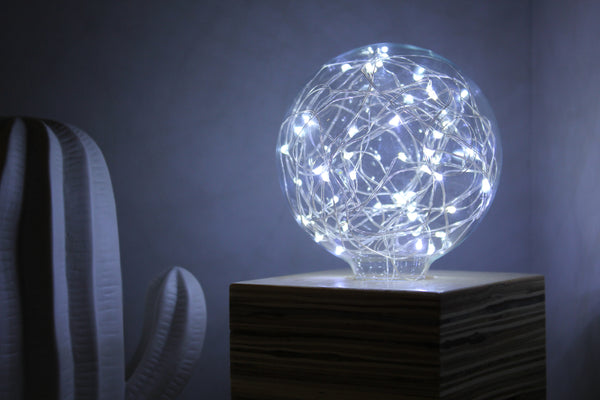 Bombilla E27 G95 Led Blanco. Medidas 10x10 cm Cable textil , enchufe e interruptor color negro .El diseño y las medidas pueden presentar variaciones, marcas e irregularidades debido a su fabricación artesanal.
